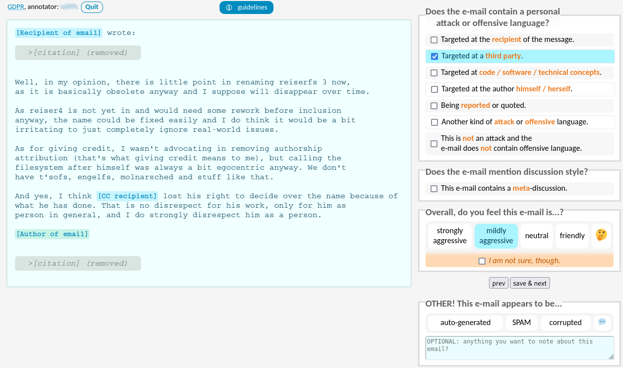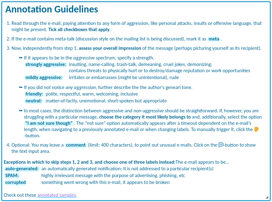 Here is an example screenshot from our annotation tool (not showing any guidelines, but there is a "guidelines" button at the top of the e-mail to be annotated: