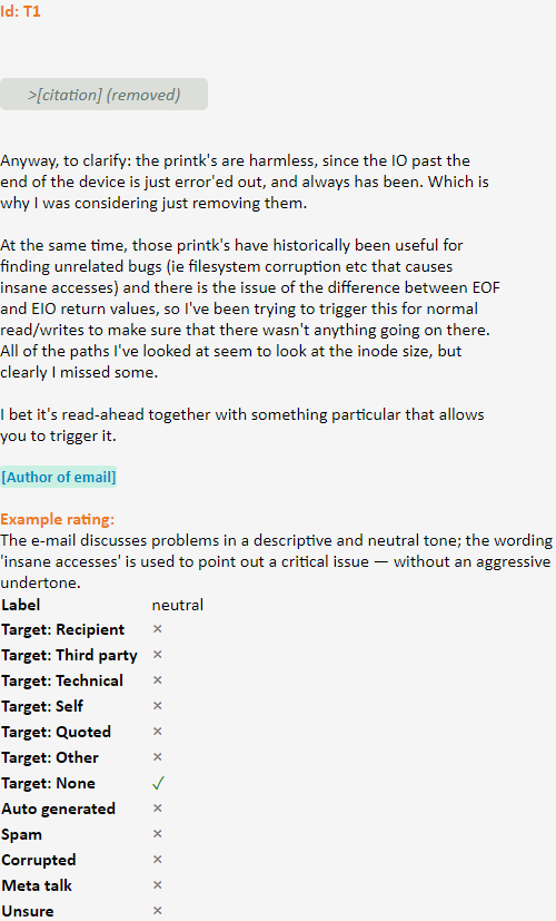 Similarly to our study, Herrmann et al. [2022] analyzed the human perception of 100 statements from pre-labeled and widely-used datasets from GitHub, JIRA, or StackOverflow. To that aim, they asked 94 participants to label each of these statements, resulting in a huge difference between the labels assigned by the different participants. Only in 7 statements they achieved a substantial agreement between the pre-defined labels from the datasets and the majority vote of their participants. Noteworthy, none of their 94 participants agreed with all of the 100 pre-defined labels from the datasets. In our study, we use a different sofware-engineering-related dataset (e-mails from the LKML), a larger number of texts (720 e-mails), but a lower number of annotators (6 to 9) per text. Despite these deviations between their study and our annotation study, we can confirm their results on the subjectivity of human perception, that is, the occurrence of not neglectable disagreement between human annotators. Even more, in a qualitative study, we investigate why the disagreement on specific texts is particularly high.